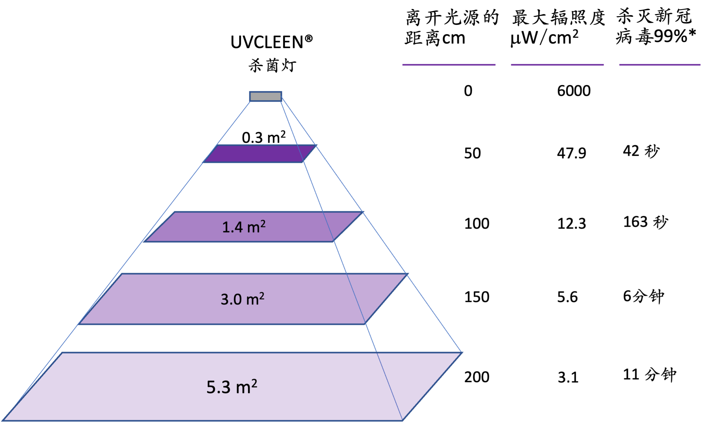 安全辐照度:American Conference of Governmental Industrial Hygienists (ACGIH)推荐的安全照射限值。设备工作时,与人的距离需不低于 50 厘米。 杀菌效率受环境温度、湿度、微尘和其他多种因素的影响。